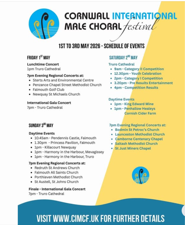 Oxford Welsh Male Voice Choir will be appearing in the following events on the Cornwall International Male Choir Festival ( CIMCF ) in May 2026